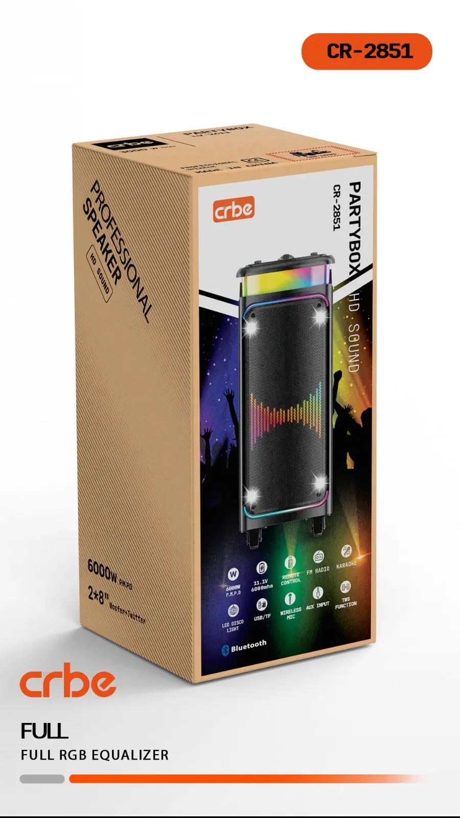 اسپیکر پارتی باکس کربی CR‑2851: قدرت صدای انفجاری با بیس فوق‌العاده عمیق و نورپردازی RGB کاملاً هماهنگ با موسیقی. ایده‌آل برای مهمانی‌های بزرگ، کارائوکه حرفه‌ای و لذت بردن از موسیقی در هر مکان. اتصال بلوتوث سریع، باتری با دوام و ورودی میکروفون برای هیجان مداوم. صدا، نور، و قدرت در یک پکیج کامل.