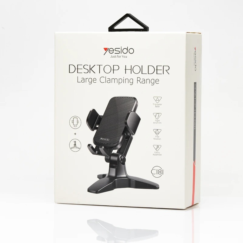 پایه نگهدارنده روی میزی یسیدو مدل C181 با ظاهری متفاوت و قوی مناسب برای استفاده در منزل ، محل کار و یا میز کار باشد. با توجه به پایه قوی محصول امکان نگهداری انواع موبایل تا عرض حداکثر 9 سانتیمتر را داراست و به راحتی می توان گوشی تا تا 360 درجه چرخاند . پایه موبایل نیز تا 140 درجه قابلیت جلو و عقب رفتن را داراست . قسمت نگهدارنده پایینی دارای شکافی می باشد تا در زمان نگهداری گوشی بر روی پایه امکان شارژ آن نیز میسر باشد .